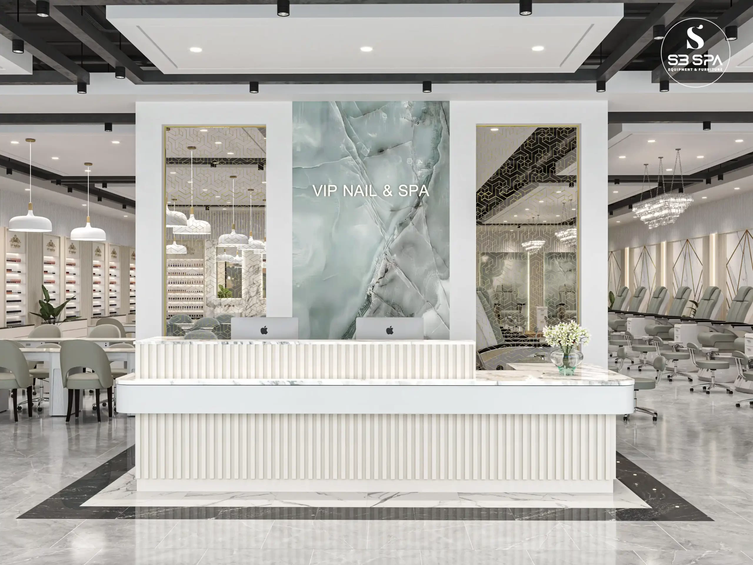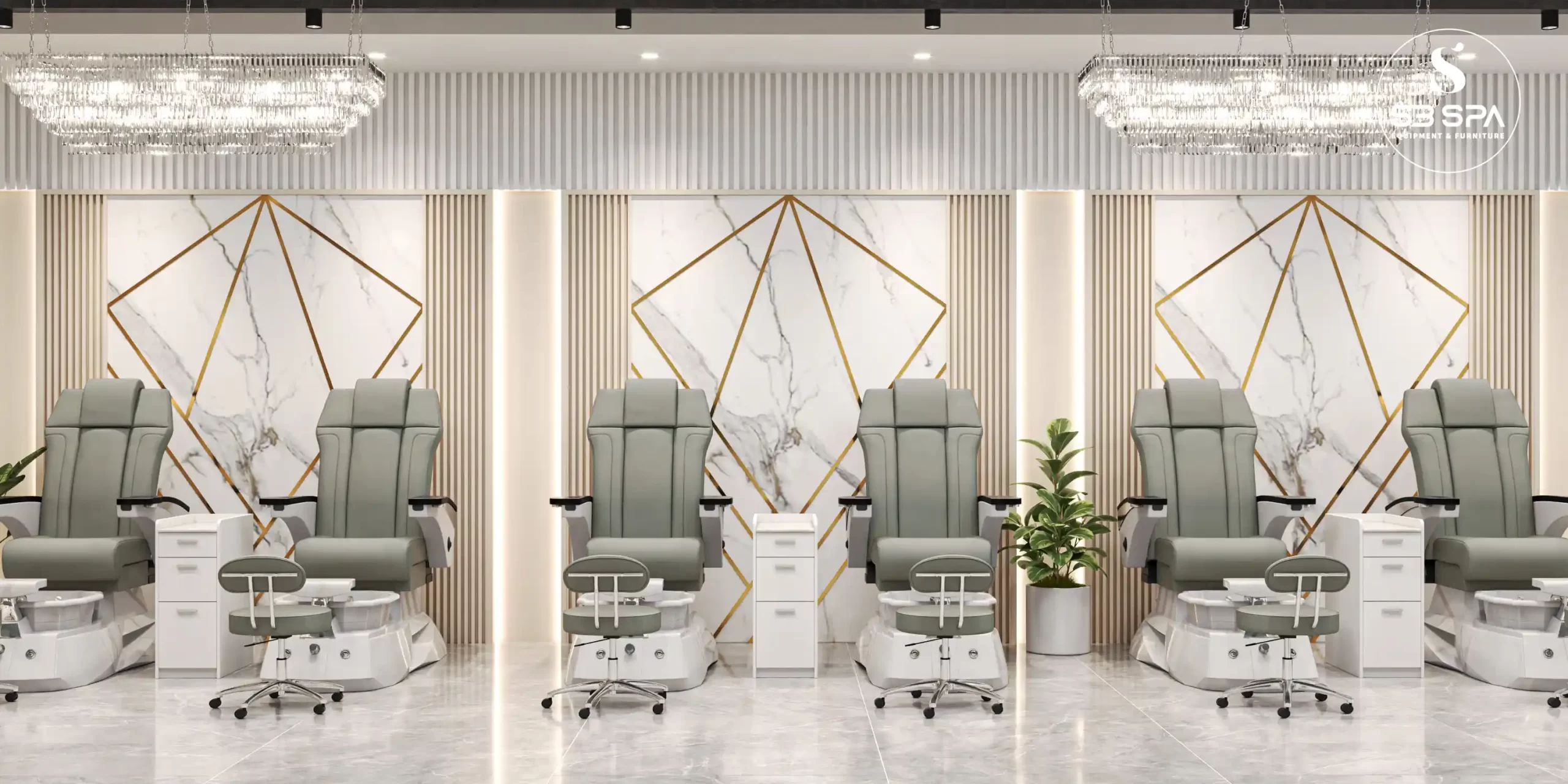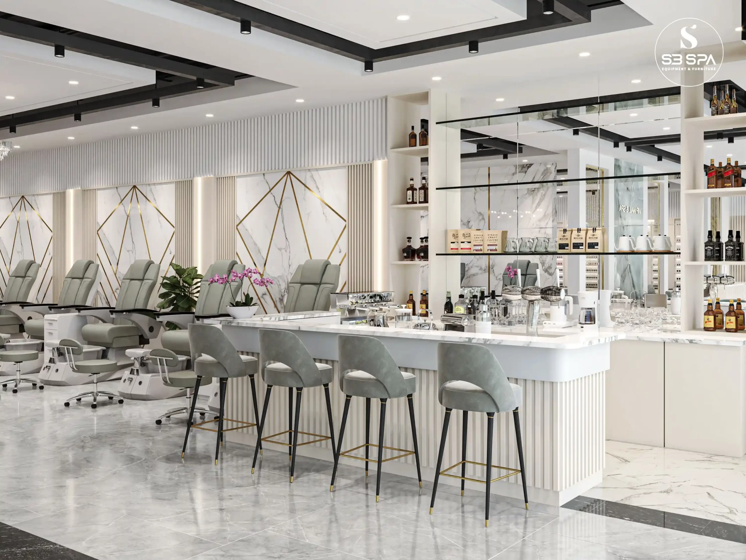 A modern luxury design with a clean, upscale feel. The space combines white marble surfaces, gold geometric accents, soft neutral tones, and sleek furnishings to create an atmosphere that feels both elegant and relaxing. Its polished finishes, bright open layout, and refined details give it a sophisticated spa-like ambiance that feels premium, stylish, and welcoming.
