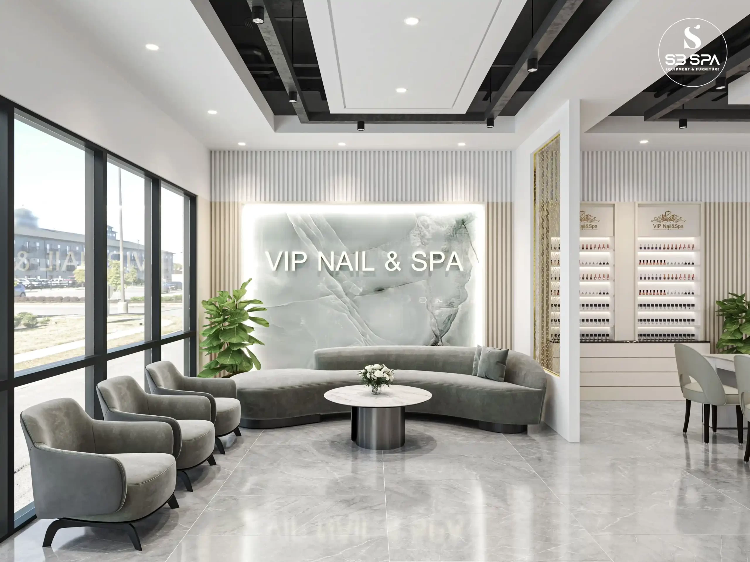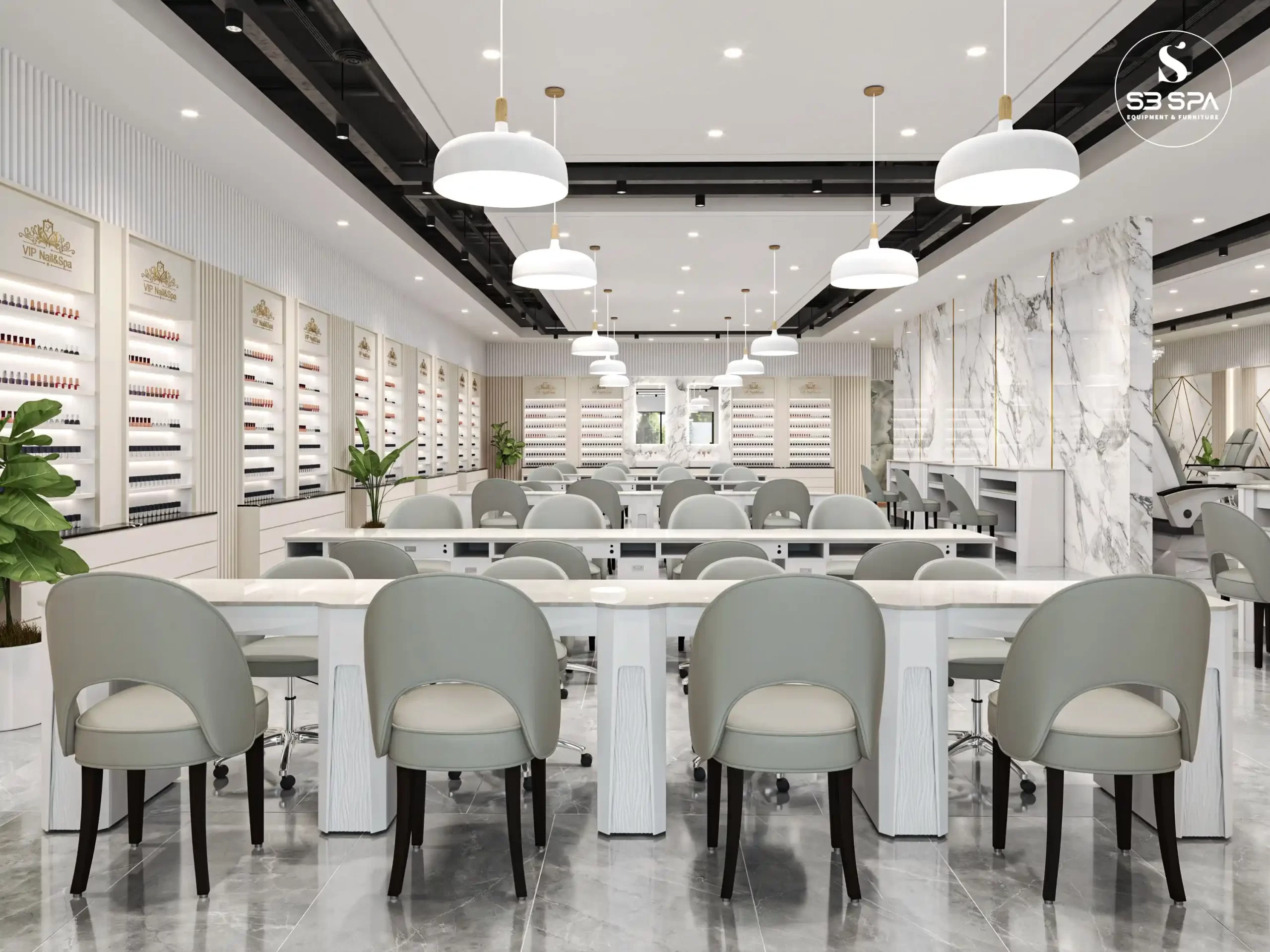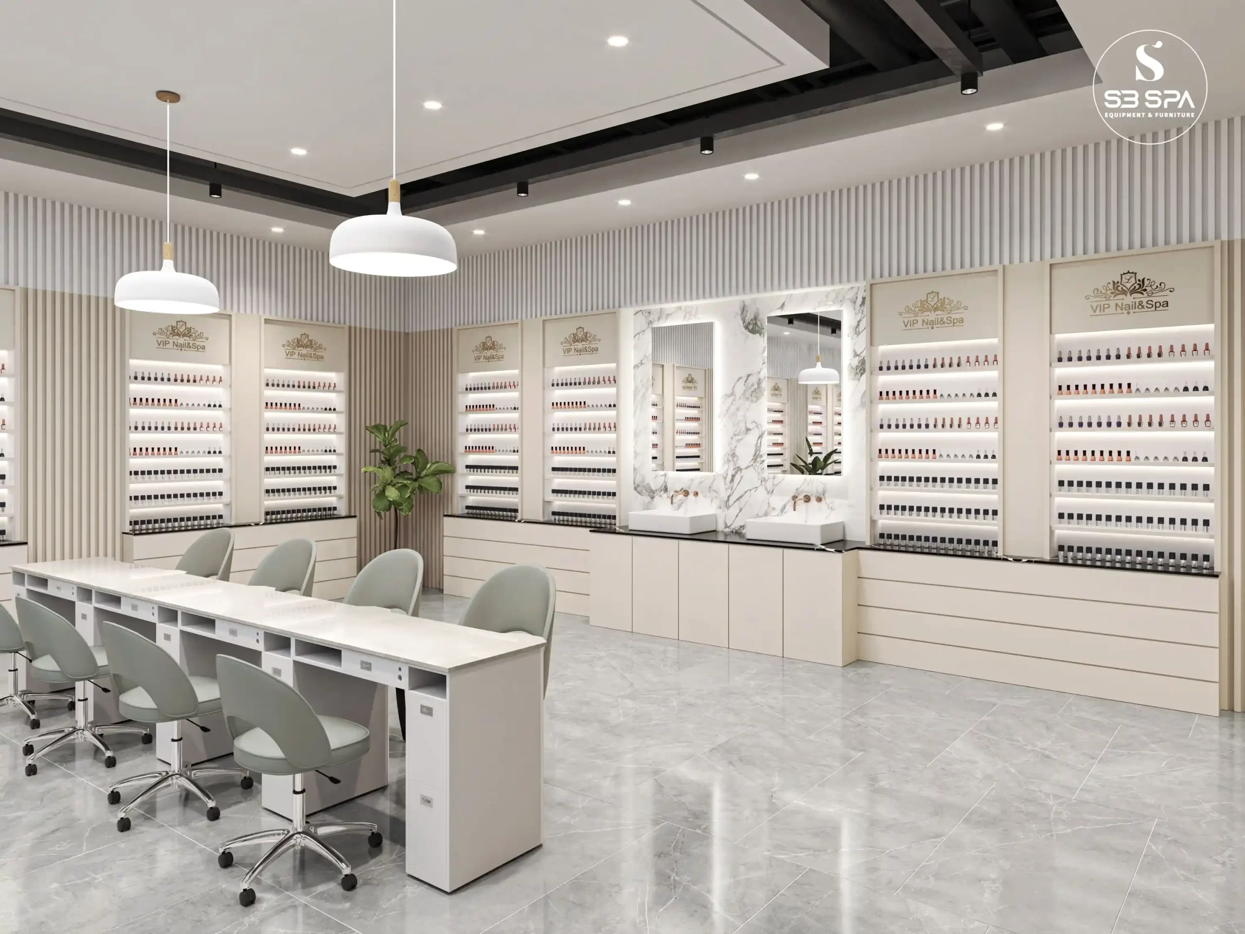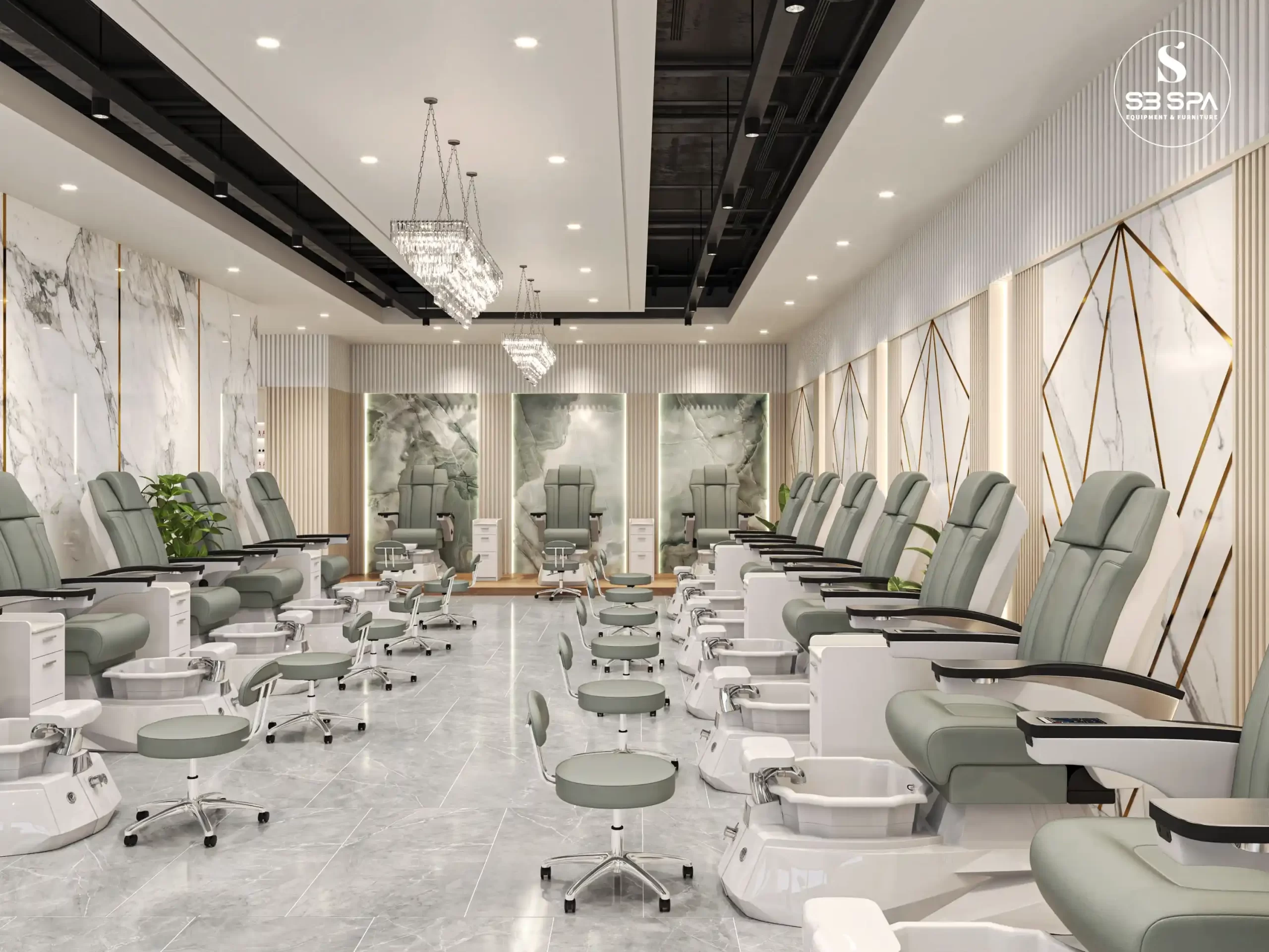 A modern luxury design with a clean, upscale feel. The space combines white marble surfaces, gold geometric accents, soft neutral tones, and sleek furnishings to create an atmosphere that feels both elegant and relaxing. Its polished finishes, bright open layout, and refined details give it a sophisticated spa-like ambiance that feels premium, stylish, and welcoming.