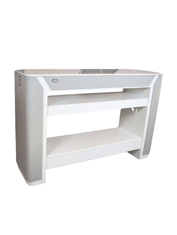 The V18S Nail Dryer 4 People is a seamless blend of sophisticated design and high-performance efficiency, crafted to elevate the modern salon environment. Featuring a luxurious white marble countertop with elegant blue veining and a refined grey wood base, this unit delivers a clean, spa-inspired aesthetic that enhances any salon interior.